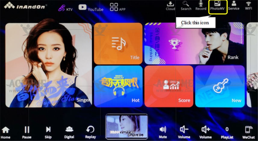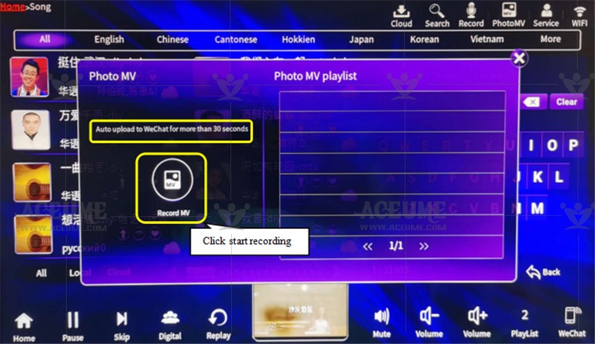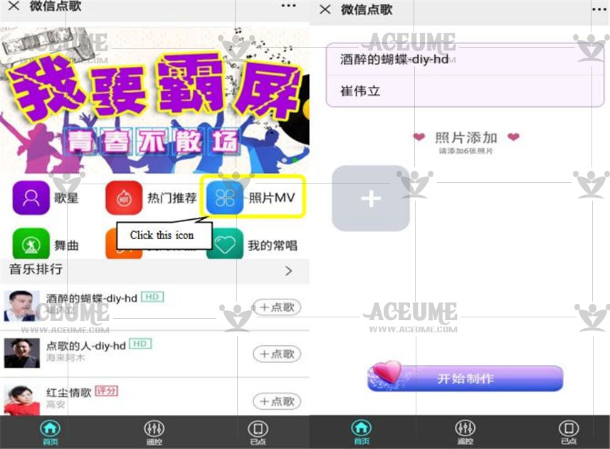 Step 2: the song has been uploaded successfully. View and play the song in the 【clicked】 list to complete the recording. Click【home page】- top right corner 【Photo MV】