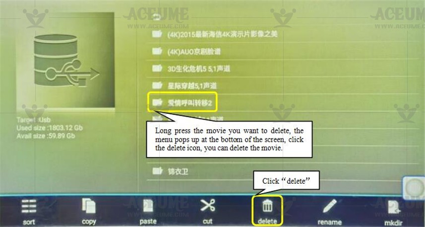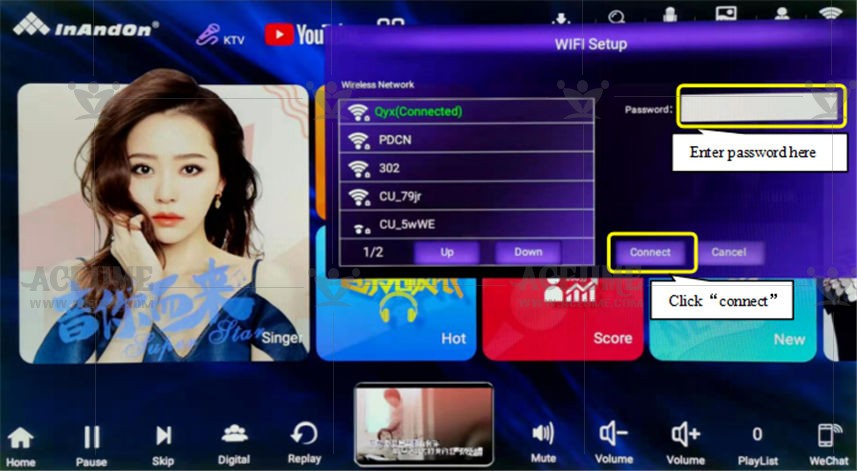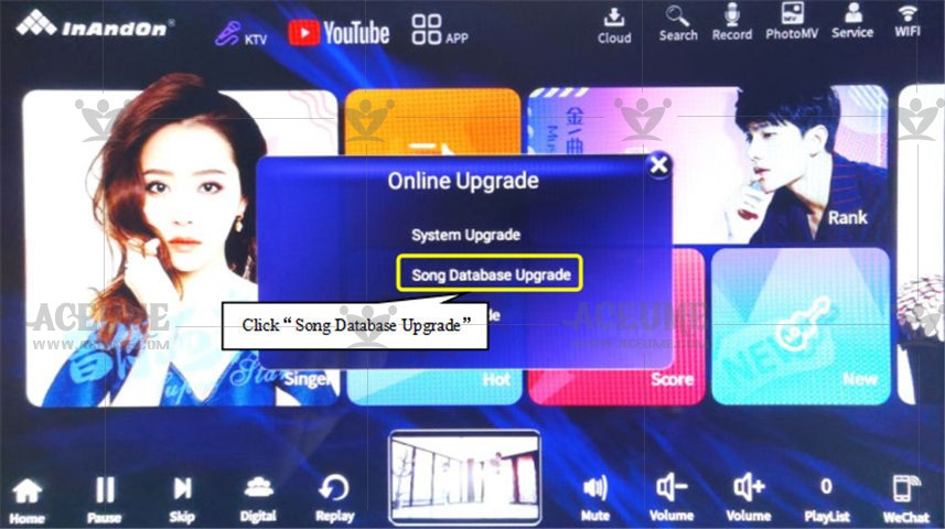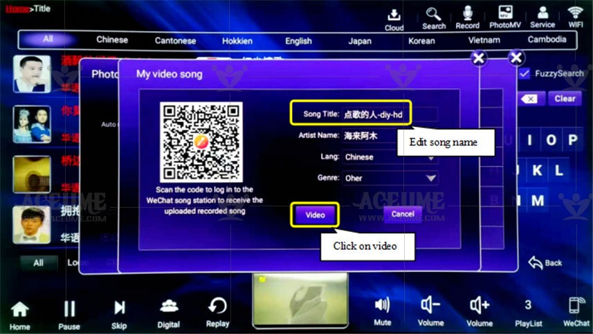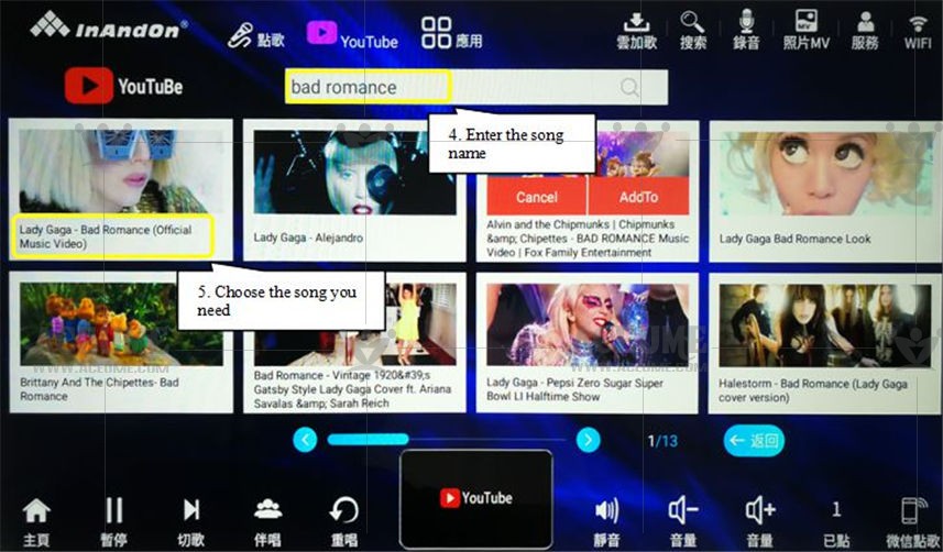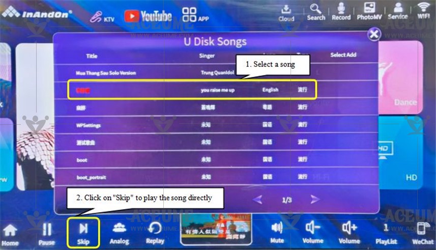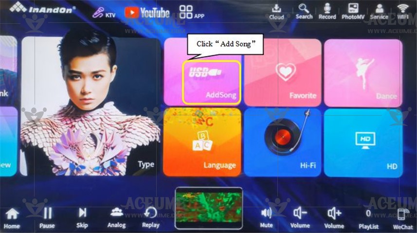 (1)U disk add songs should be placed in the U disk newsong folder. Song naming format: singer-song name- language.mkv For example: Andy Lau-Bingrain-Mandarin.mkv. Supported formats: mkv, mpg, dat, vob,wmv, avi, mp3, wav.