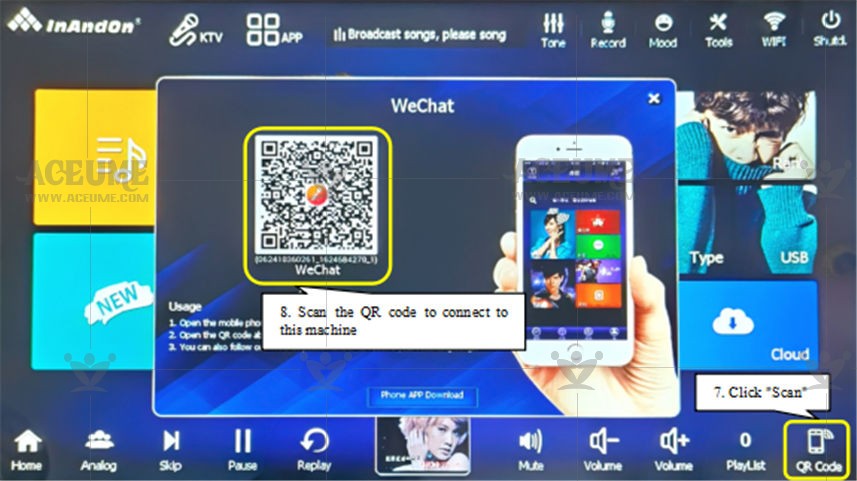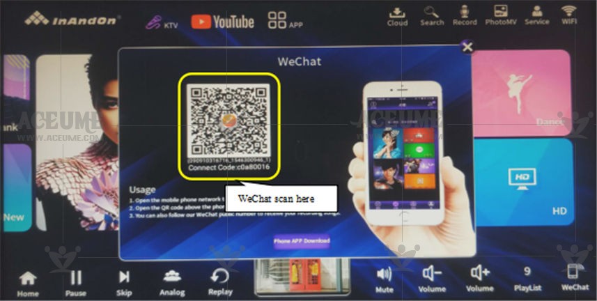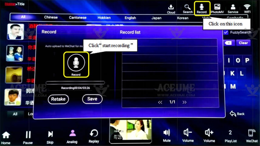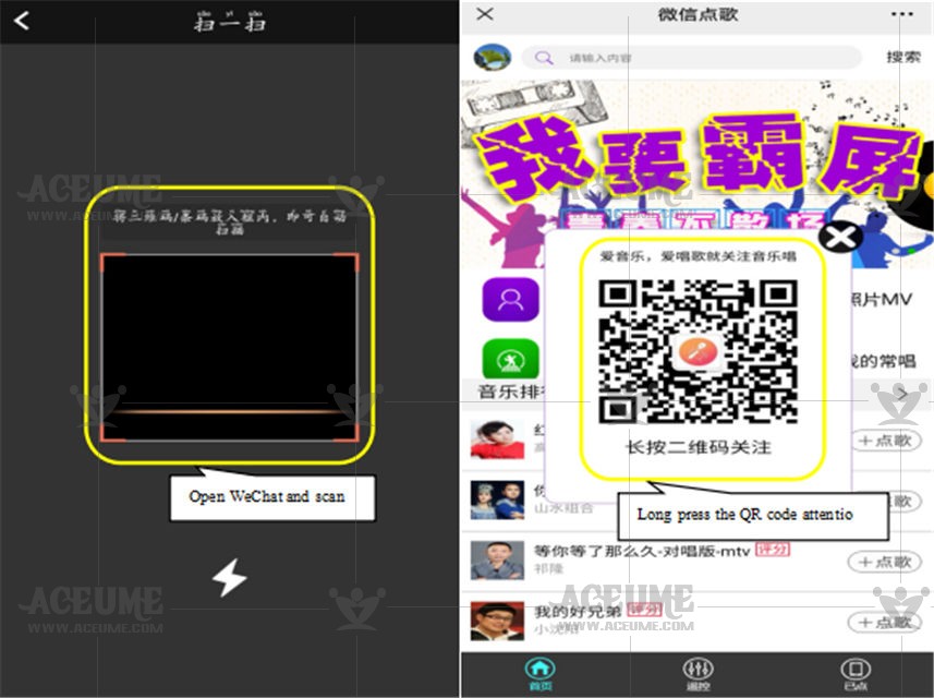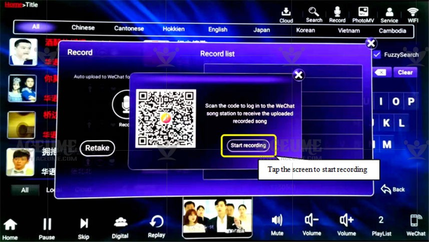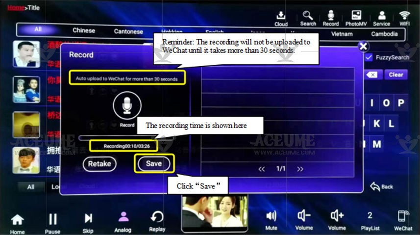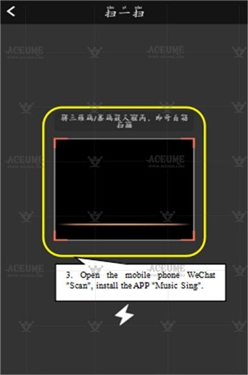 Step 4: Scan the code on the mobile phone We Chat to enter the official account Music Sing, and click on the screen 【Start Recording】. (System prompt: The recording is over 30 seconds before uploading to We Chat.) Click Save to complete the recording.