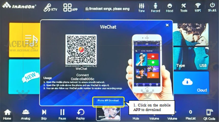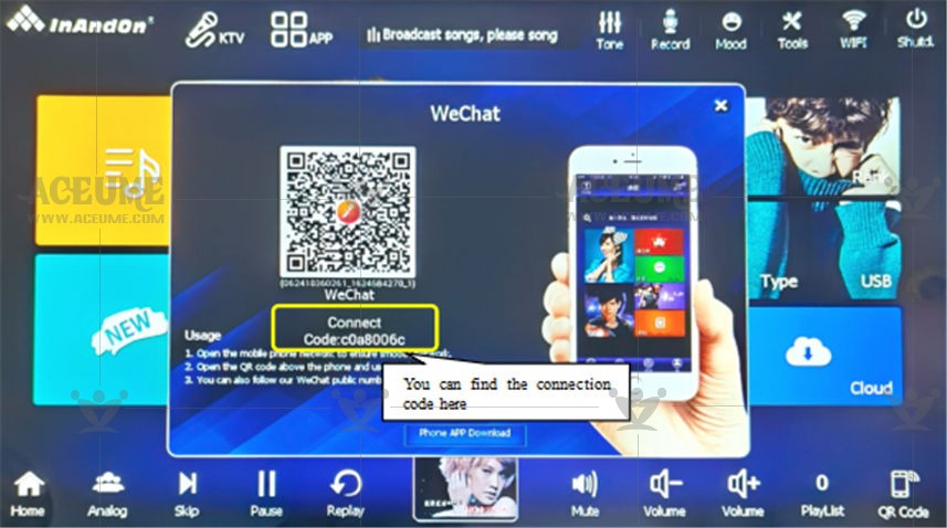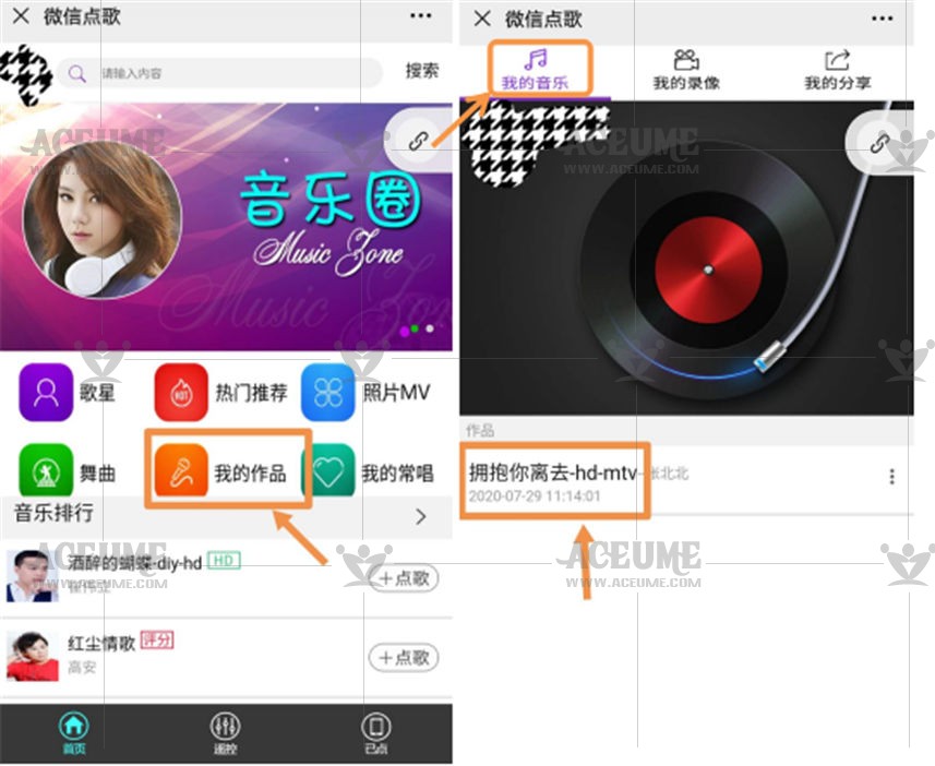 Step 2: Step 2: view and play the song in the 【ordered】 list to complete the recording After the recording is completed, you can scan the code to log in to the We Chat song station and enter "My Works" (you can also manually click Save to interrupt the recording). After the recording is completed, you can audition, delete, download (copy to U disk), and share.