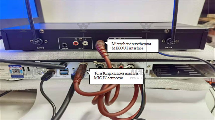 (1) Connect one end of the microphone cable to the MIC IN port of the player and the other end to the MIX OUT port of the reverberator. (Please watch the cable installation video)