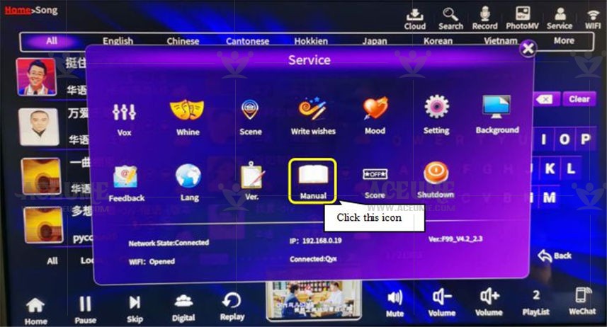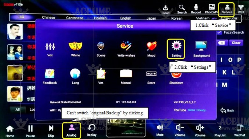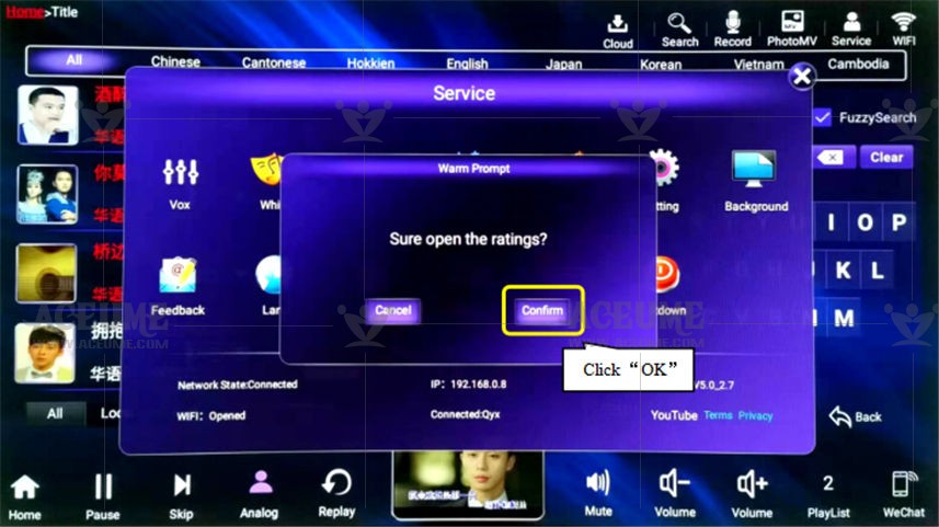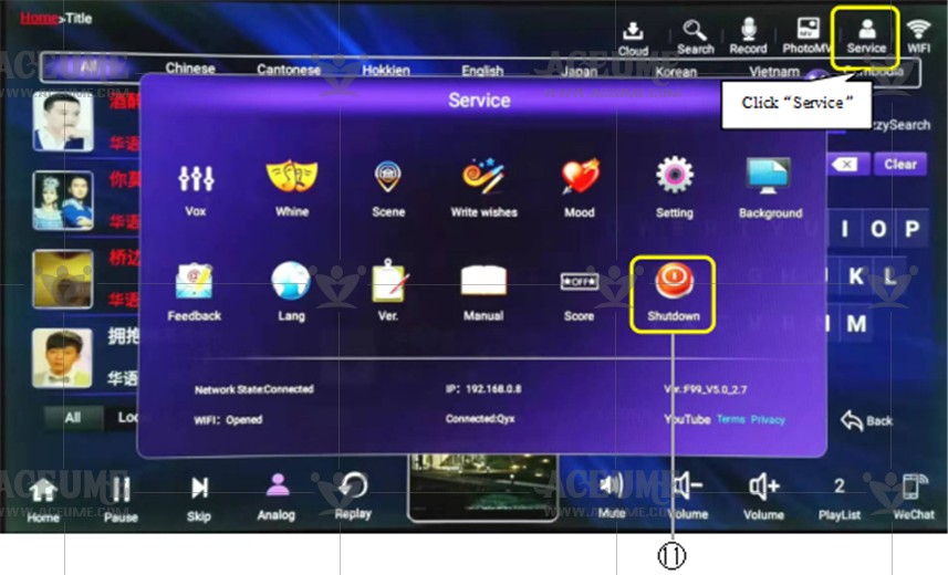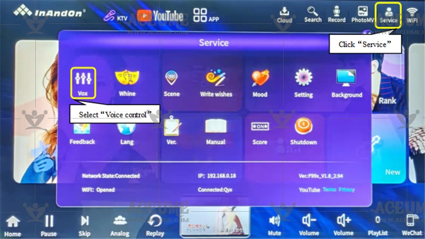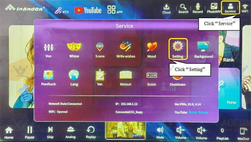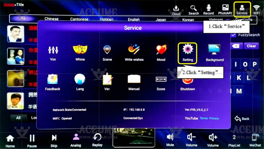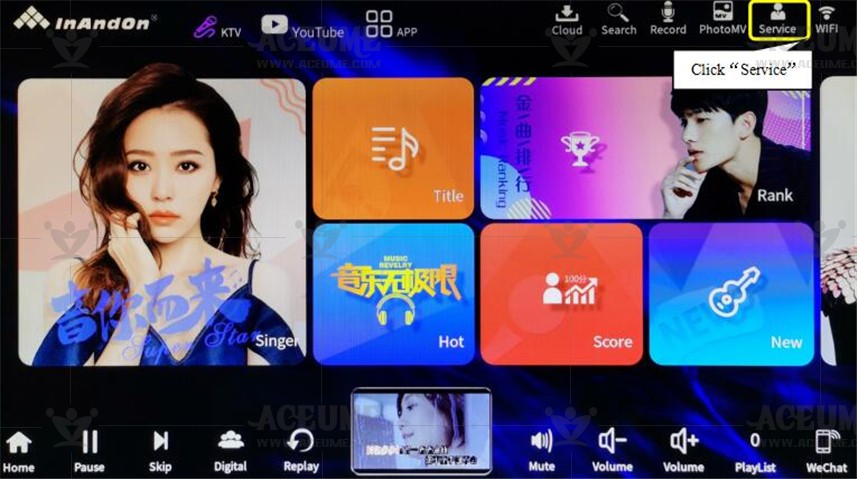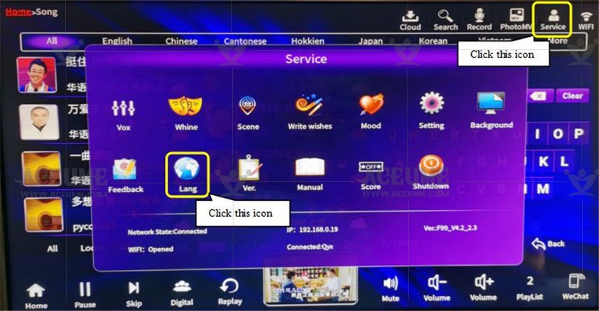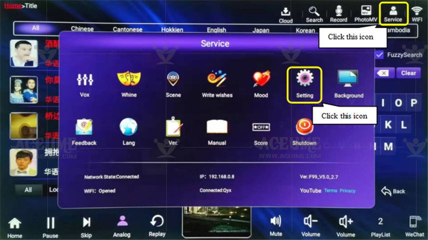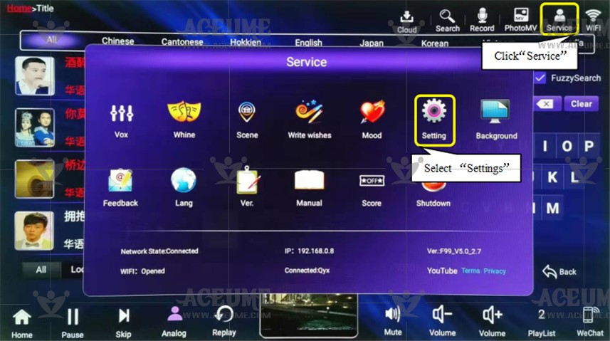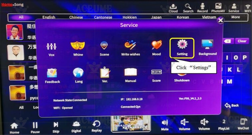 3.How to turn off voice song request function.●Click the 【Service】 icon at the top right of the home page, click the 【Settings】prompt to enter the password: "347437", click "Confirm", enter the"Voice Switch" and set it to "OFF".