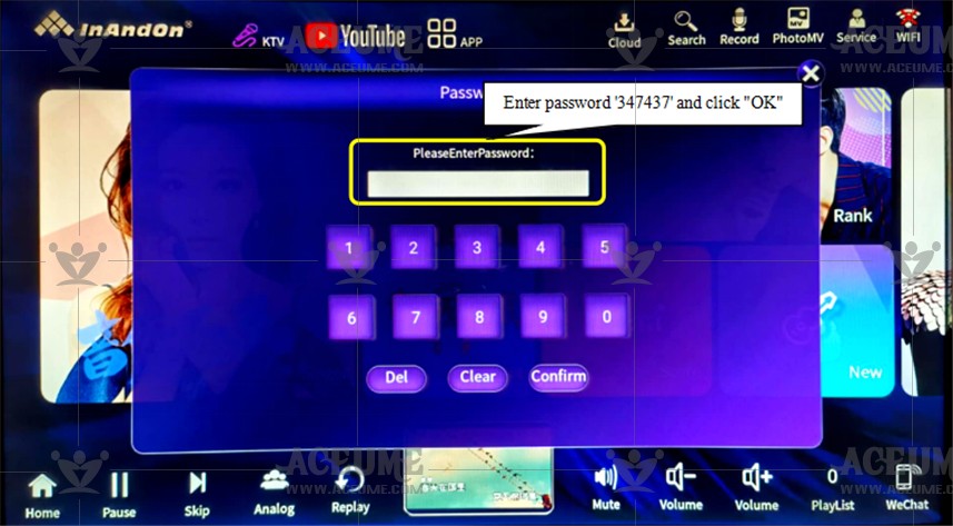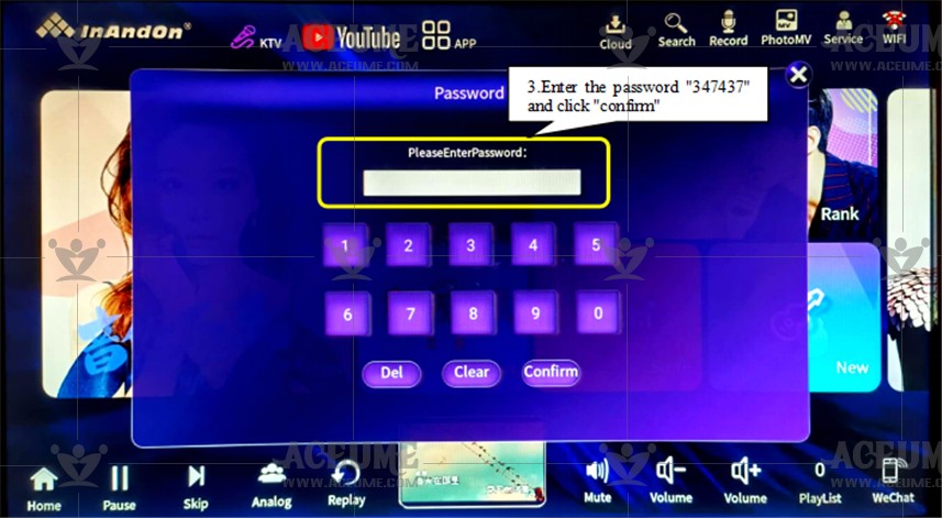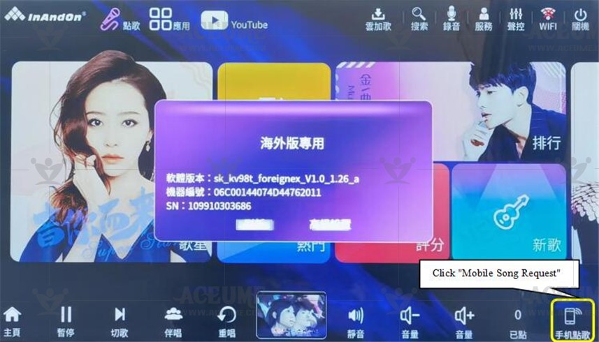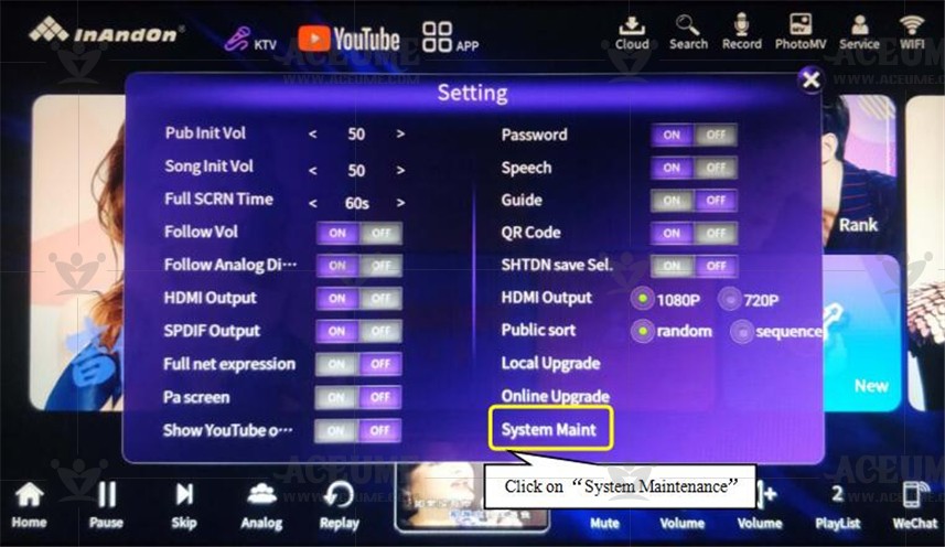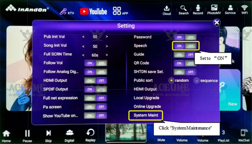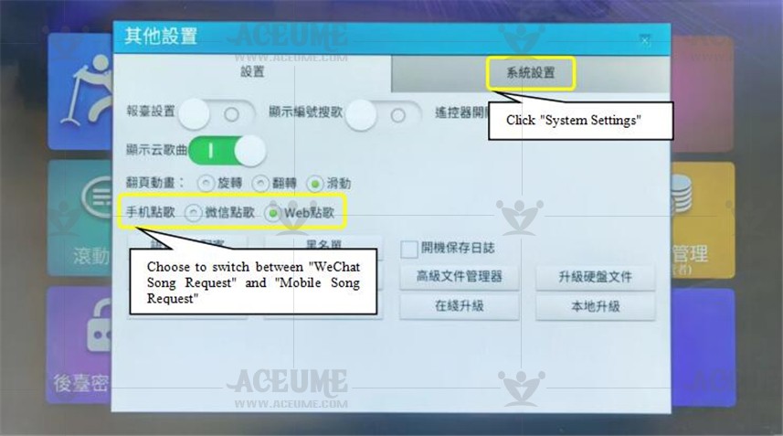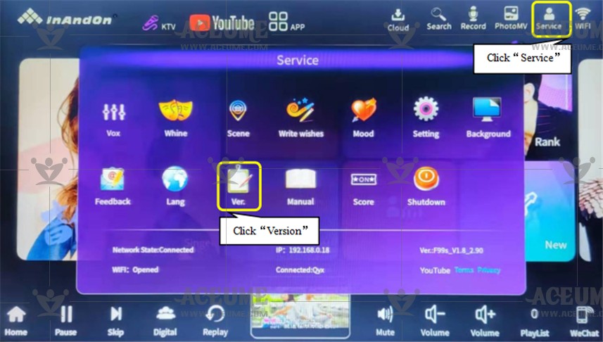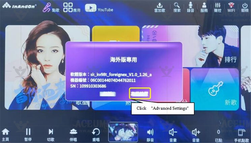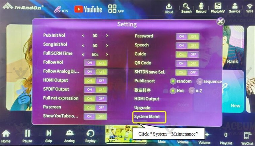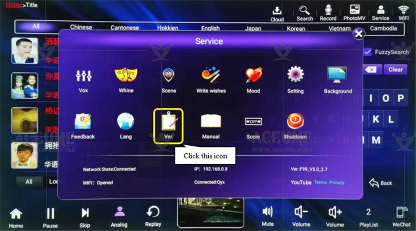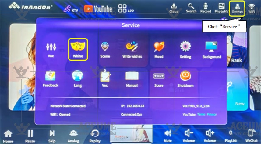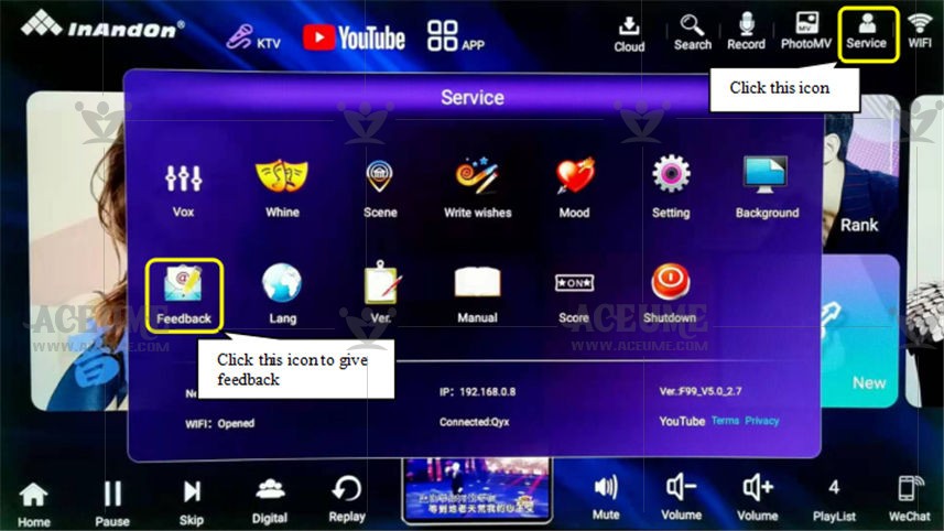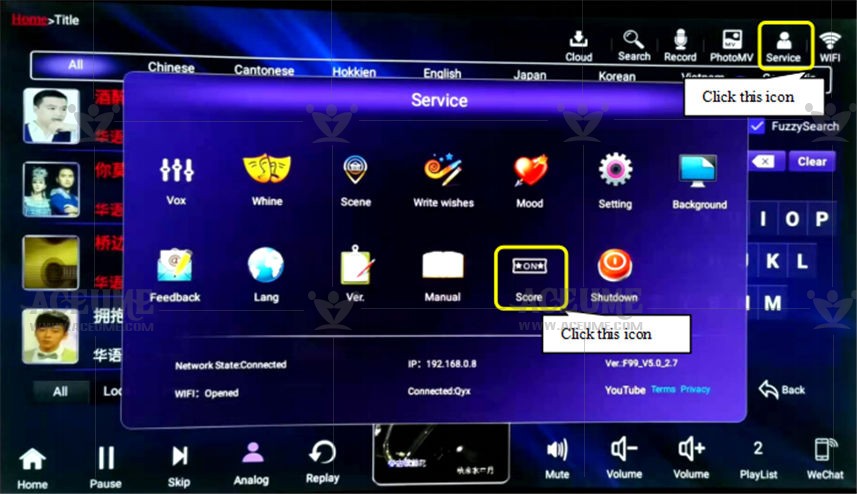 3.How to turn off voice song request function.●Click the 【Service】 icon at the top right of the home page, click the 【Settings】prompt to enter the password: "347437", click "Confirm", enter the"Voice Switch" and set it to "OFF".