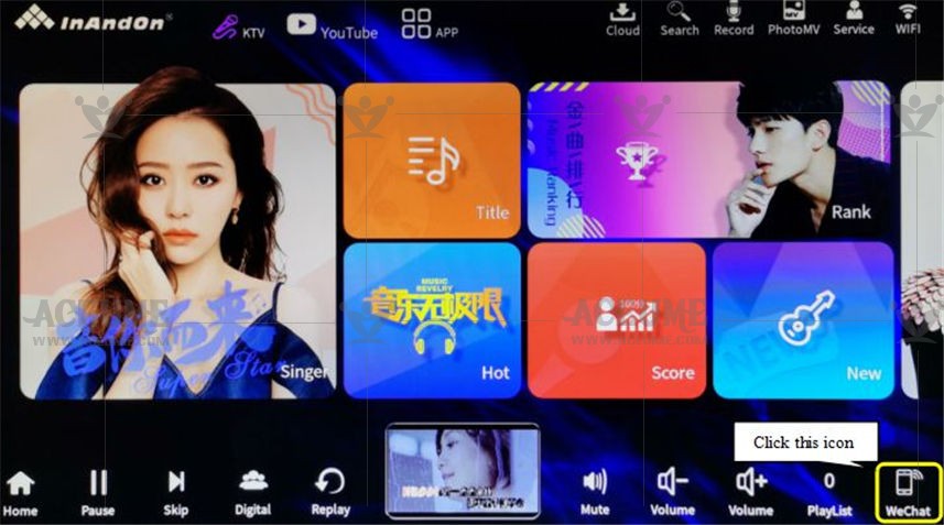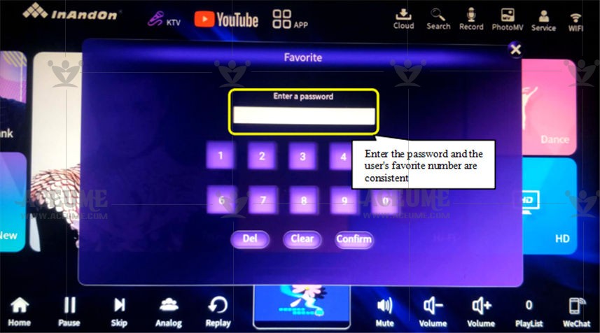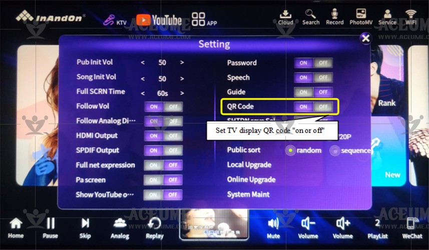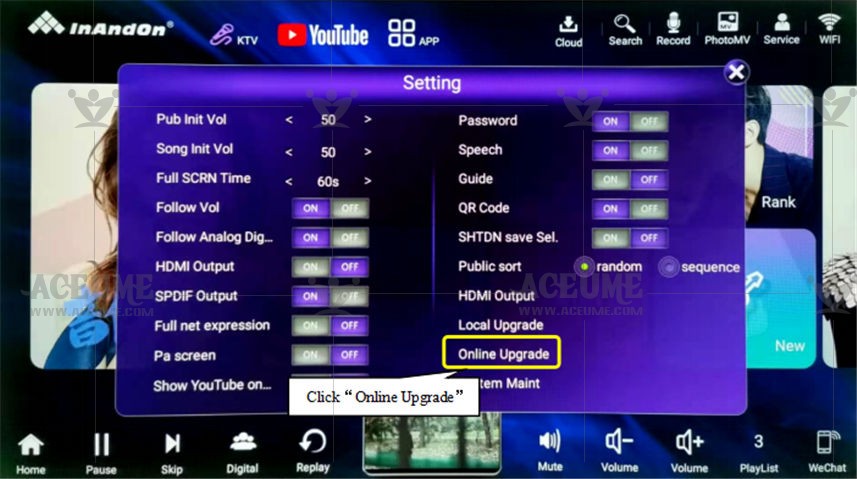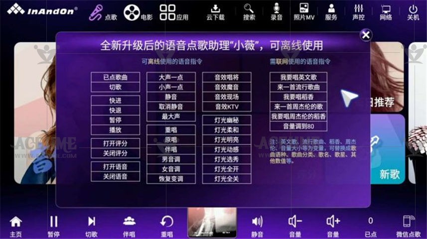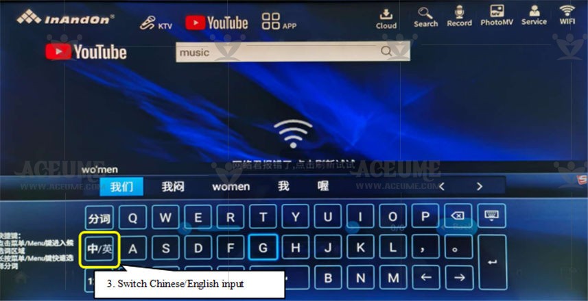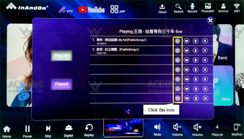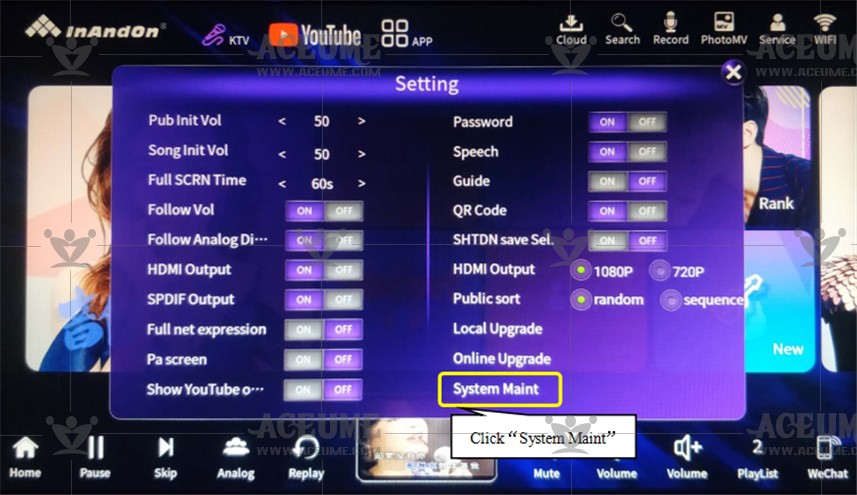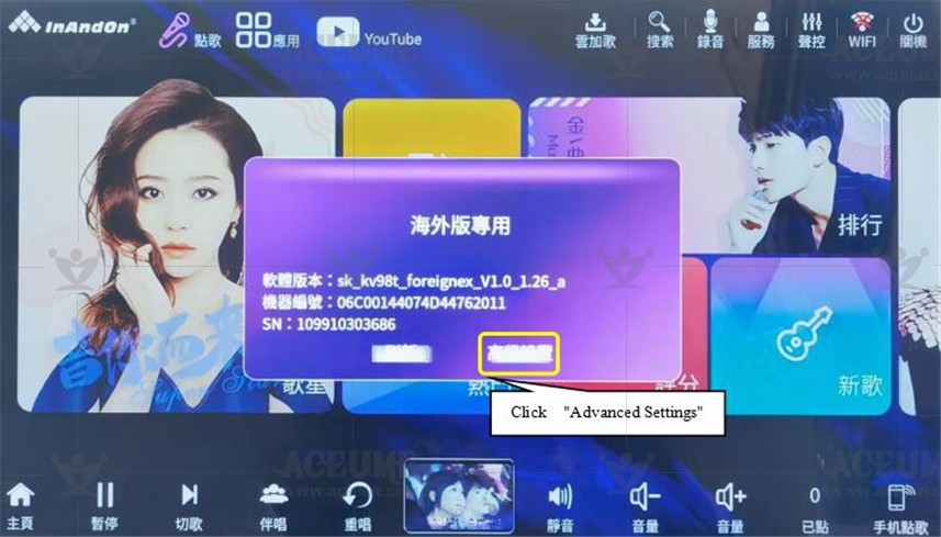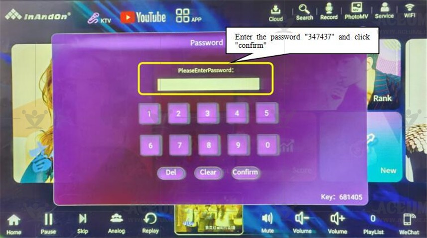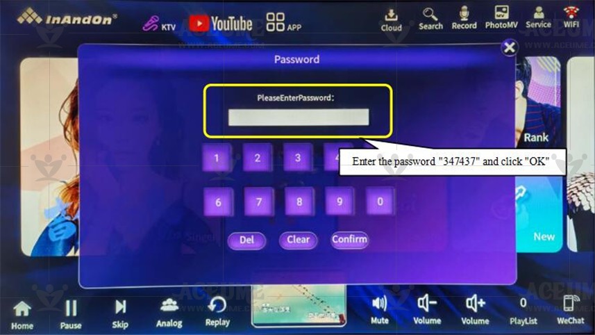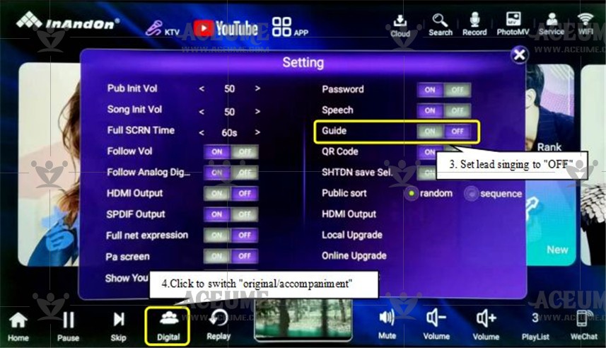 3.How to turn off voice song request function.●Click the 【Service】 icon at the top right of the home page, click the 【Settings】prompt to enter the password: "347437", click "Confirm", enter the"Voice Switch" and set it to "OFF".