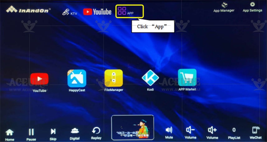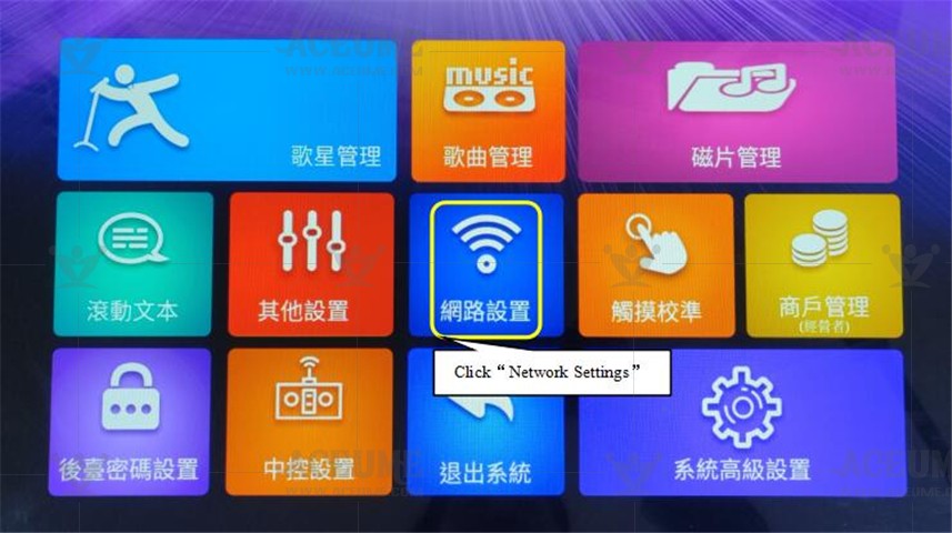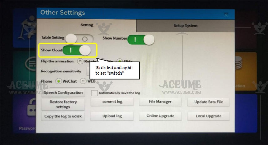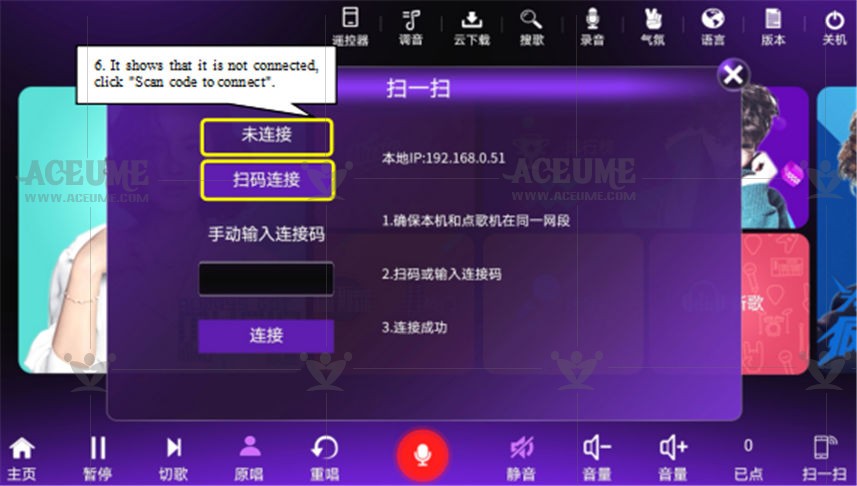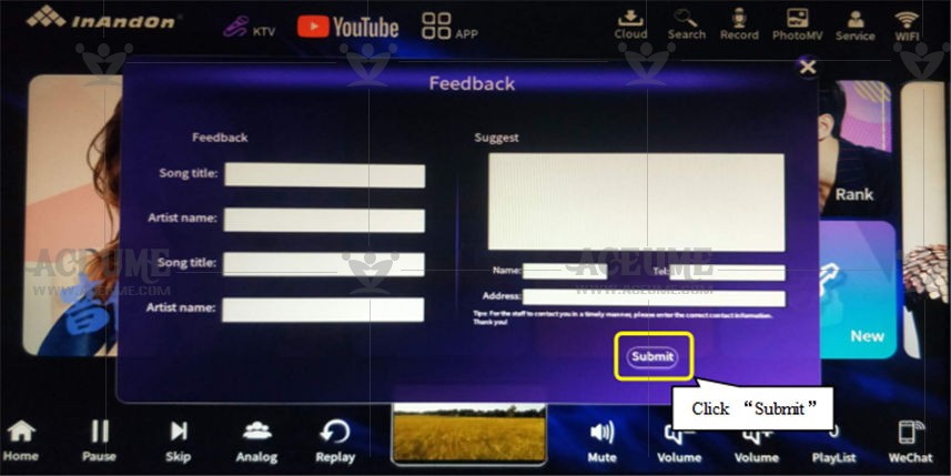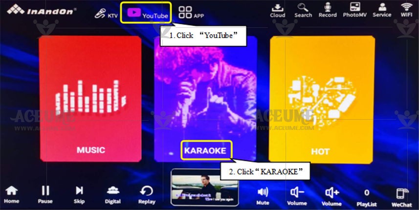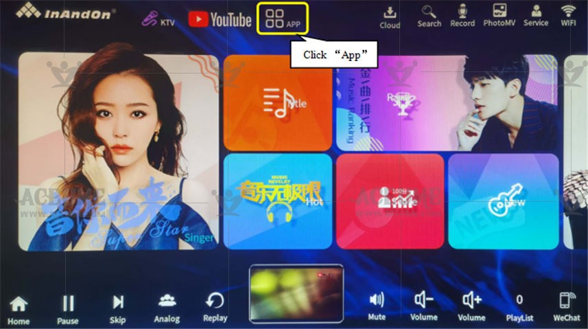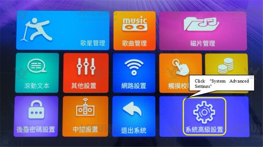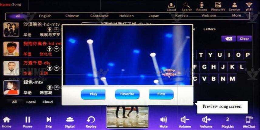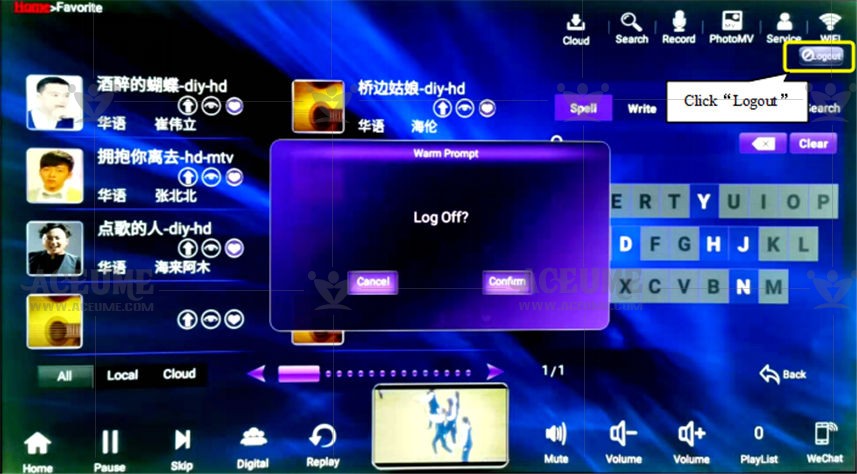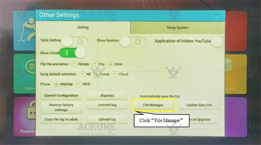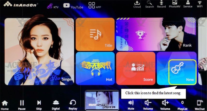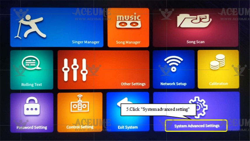 3.How to turn off voice song request function.●Click the 【Service】 icon at the top right of the home page, click the 【Settings】prompt to enter the password: "347437", click "Confirm", enter the"Voice Switch" and set it to "OFF".
