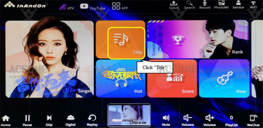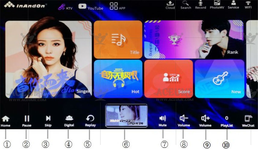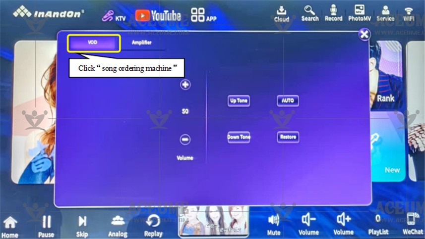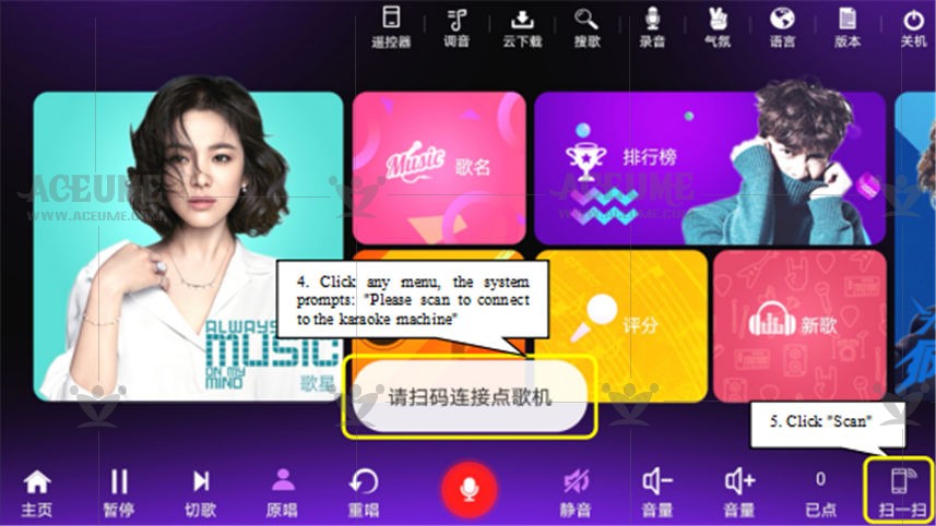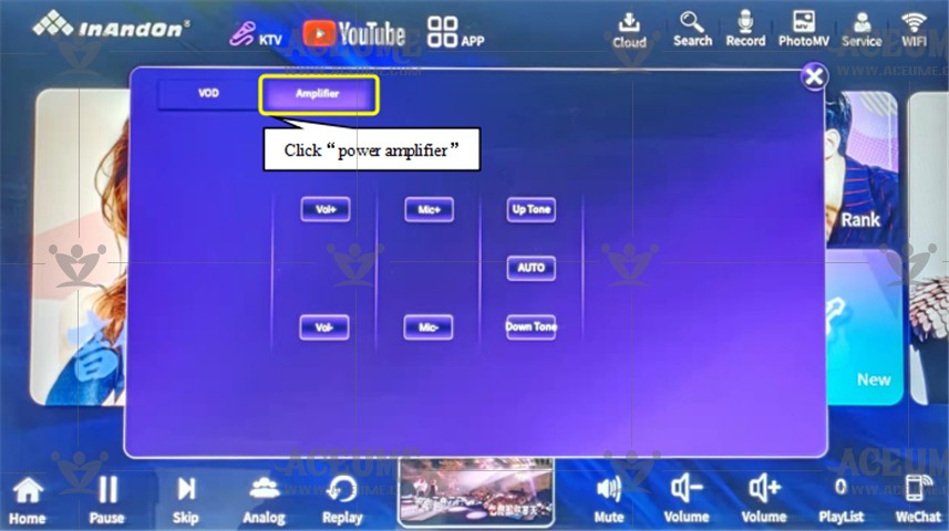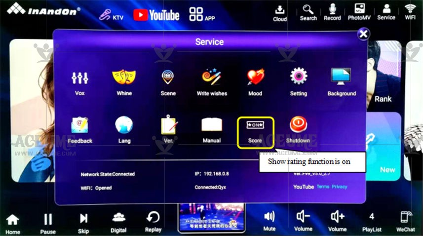 ● Click 【Service】 -- 【Voice control】 icon, some songs can not be sung in high pitch, low bass. Find the right tone to make your singing easier.