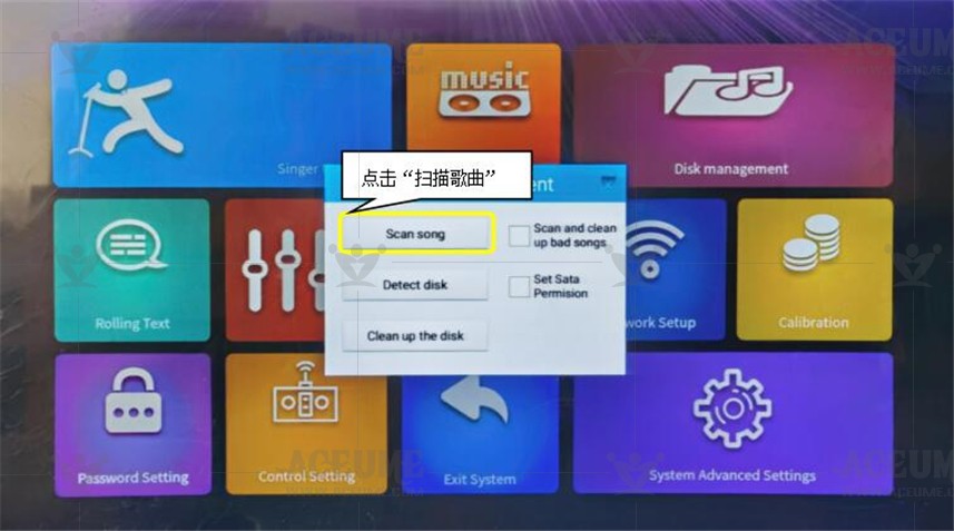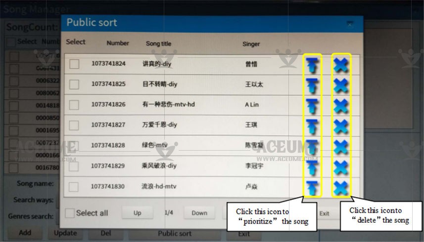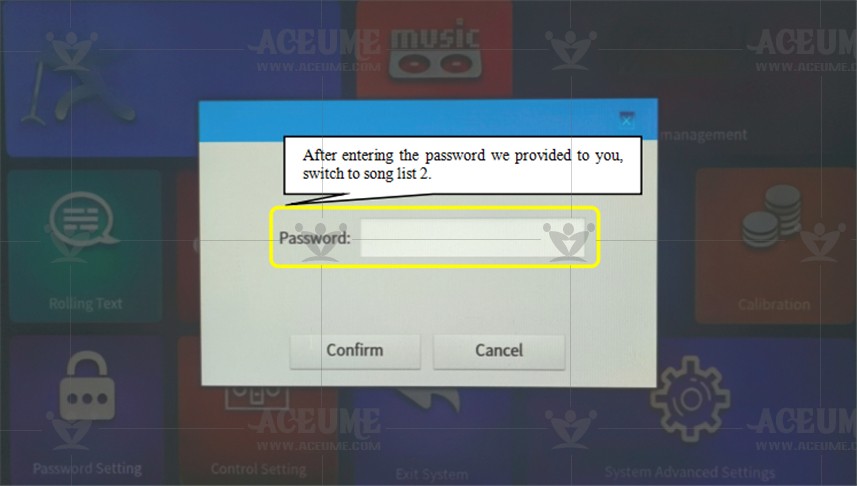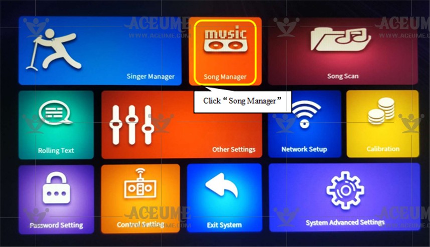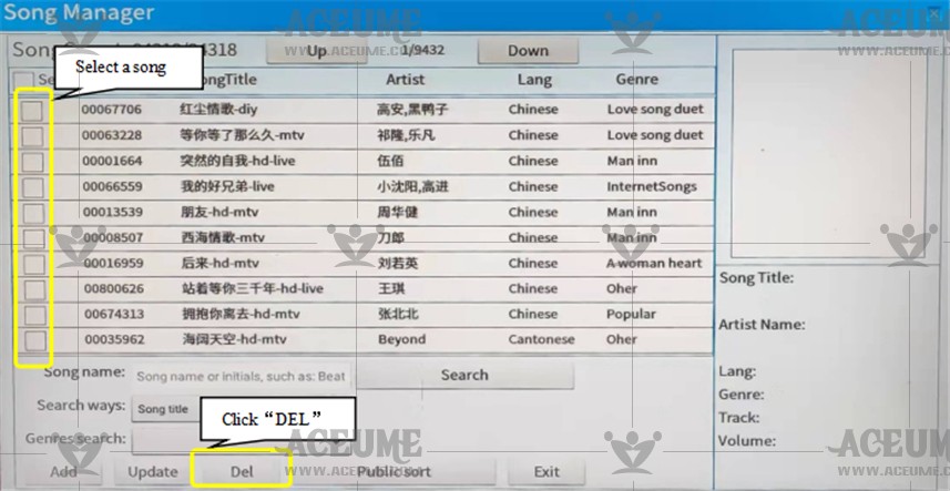 ● Click 【Service】 - 【Setting】 enter the password ‘347437’ and click 【Confirm】 Select 【System maintenance】 - 【Song management】to enter the song management interface Select the song you want to delete.