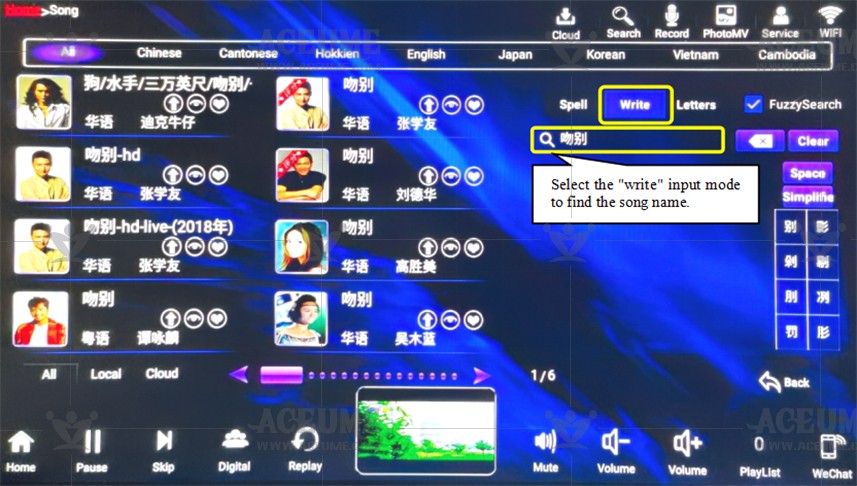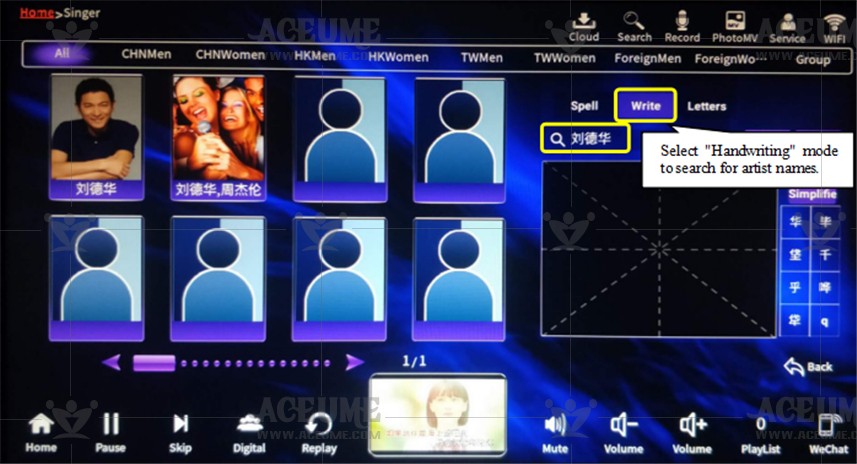 (2) For example: select the "write" mode and enter the name of the singer to find your favorite singer.