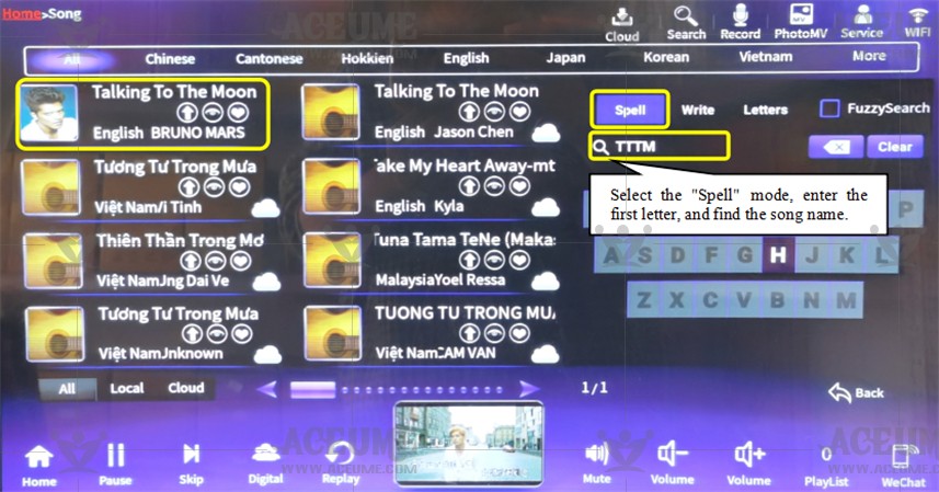 (3) For example, find the English song 'Talking To The Moon', select the "Spelling" mode, and enter the first letter of the English song 'TTTM' to display the relevant English songs.