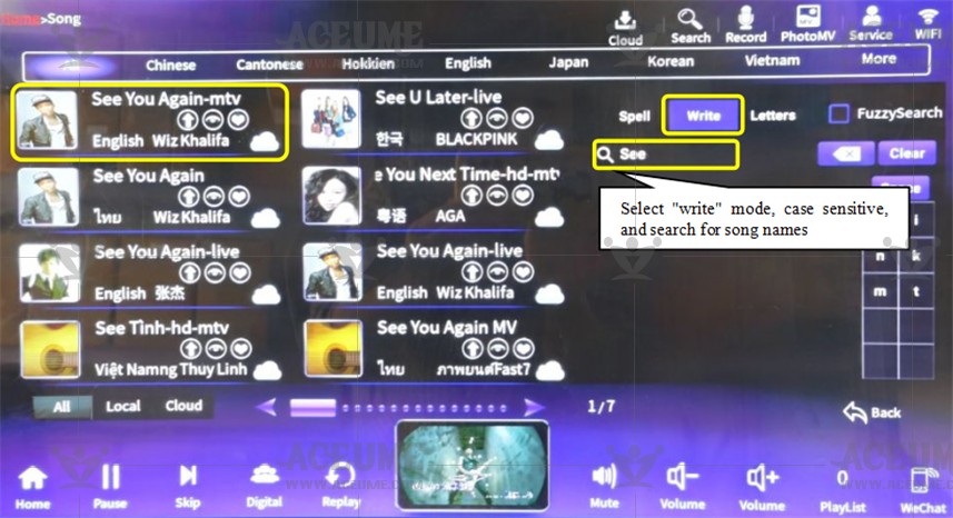 (4) For example, find the English song 'See You Again', select the "write" mode, and enter the English song letter 'See', which is case sensitive, to display the relevant English songs.