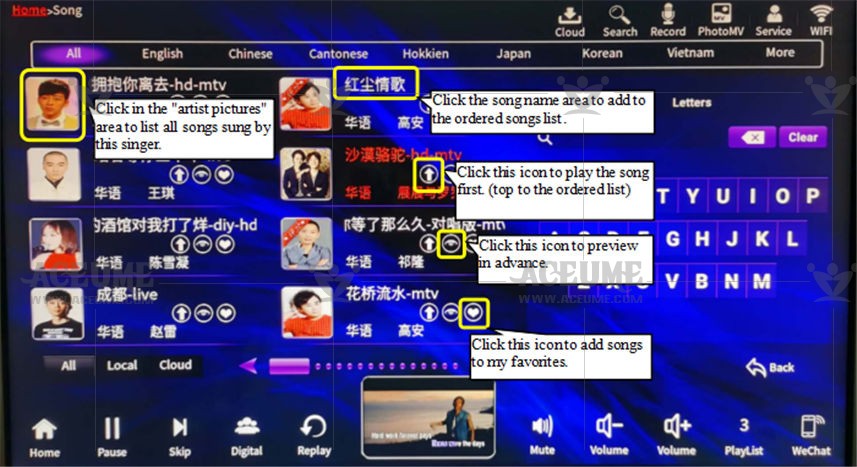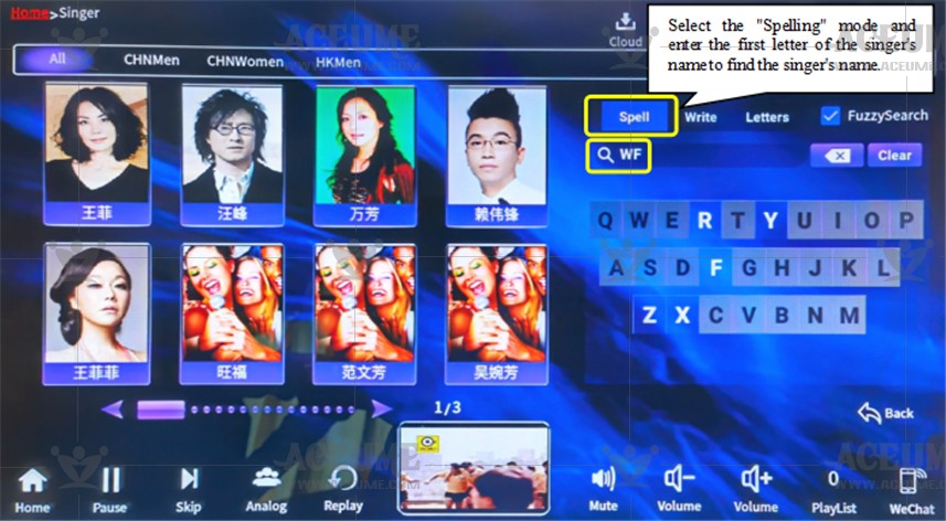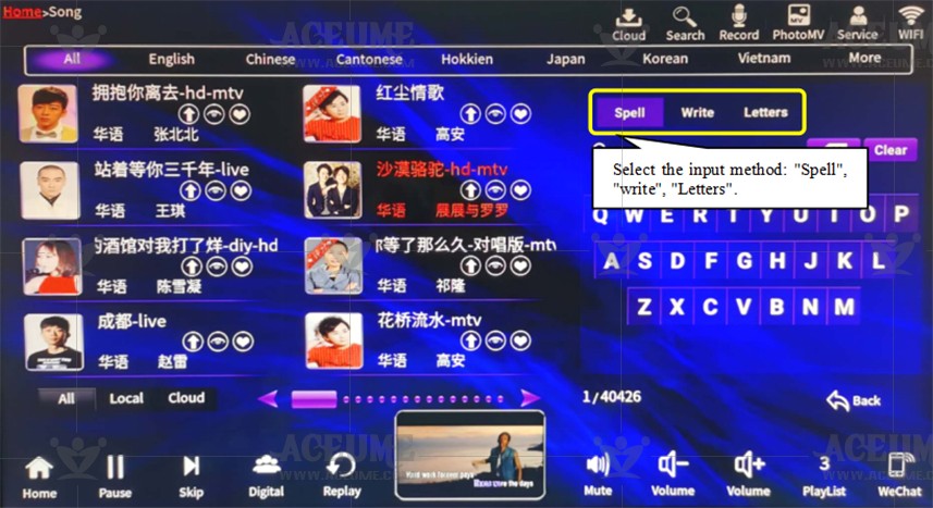 (1) For example: select the "spelling" mode and enter the first letter of the singer's name to find your favorite singer.
