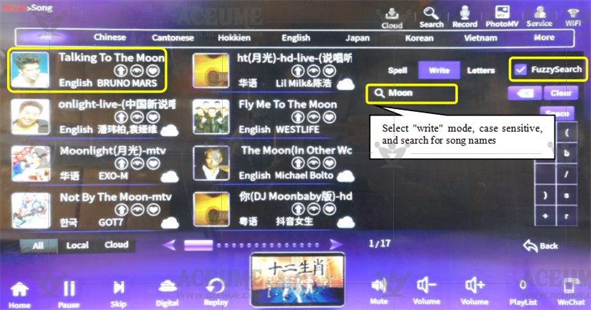(5) For example, select【Fuzzy Search】to find the English song 'Talking To The Moon', select the " write" mode, enter the English song letter 'Moon' to distinguish case, and the relevant English songs will be displayed.