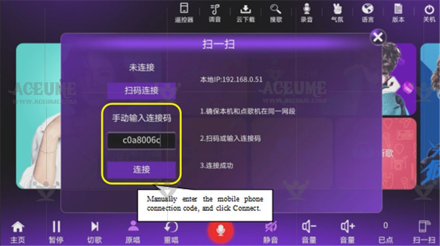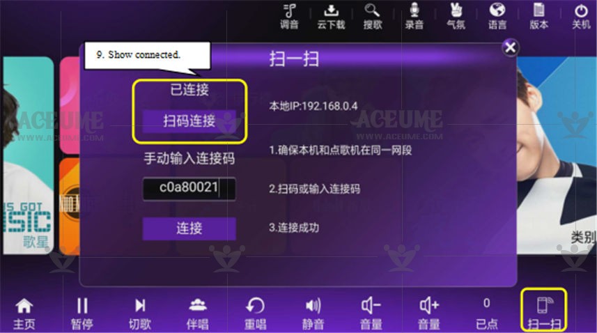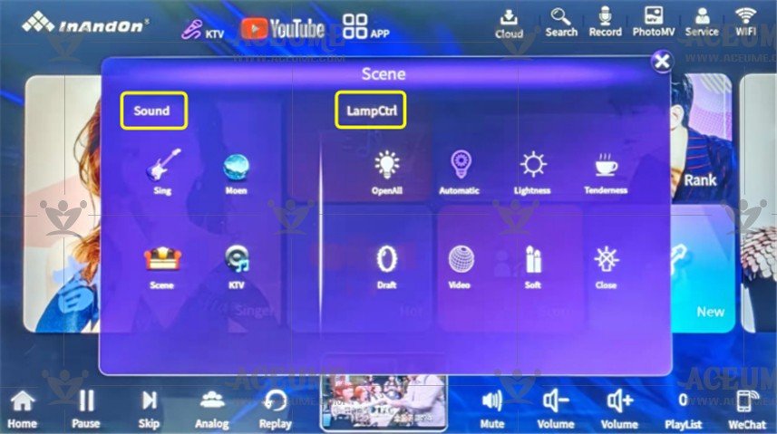 ● Click the 【Scene】 lamp control: dynamic, soft, bright, lyrical, automatic mode, fully on, draft mode, fully off (need to connect the central control box use). Sound control: singing general, magic sound, live, KTV.