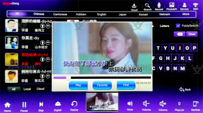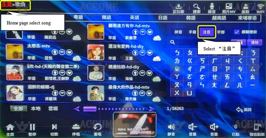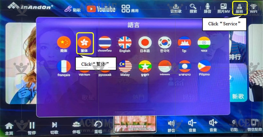 ●Click 【Service】--【Language】and select 【Traditional】 language. Return to 【Home】-- the input method on the right side of 【Song name】 and click the "Zhuyin" input method. Here, you can use the "Zhuyin" input method to search for songs.