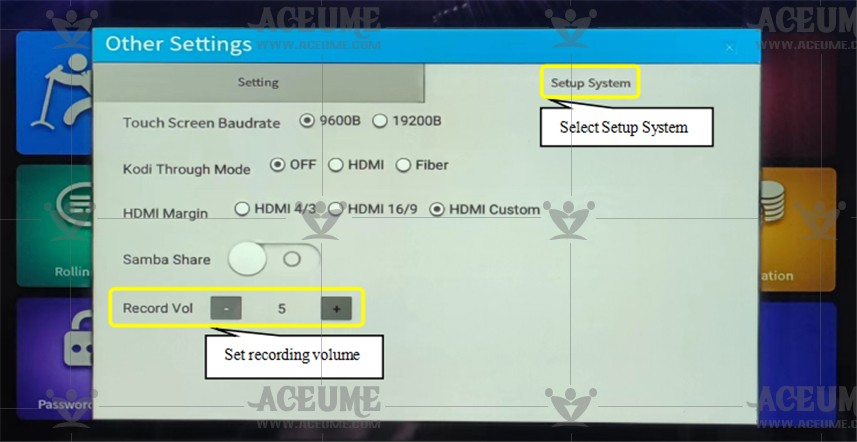 ● First, set the recording sound size. Click 【Service】--【Setting】, enter the password '347437', and click "OK".