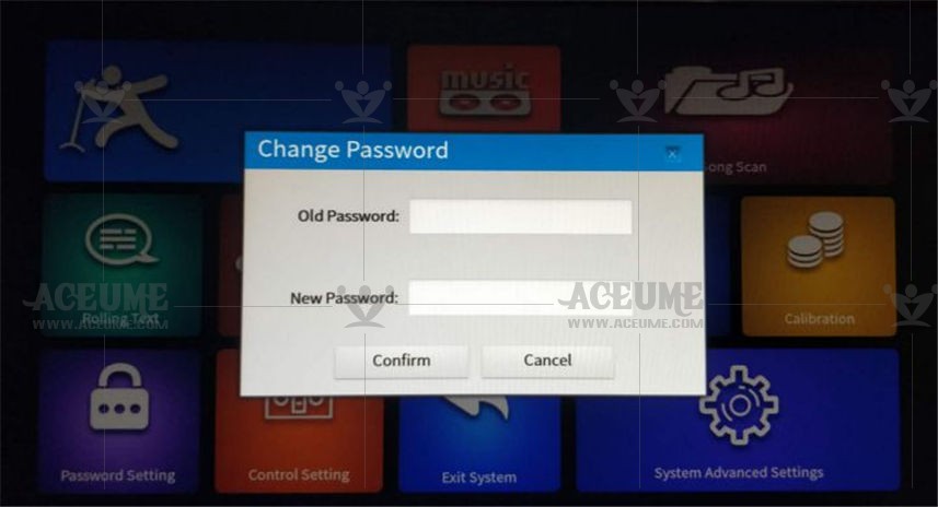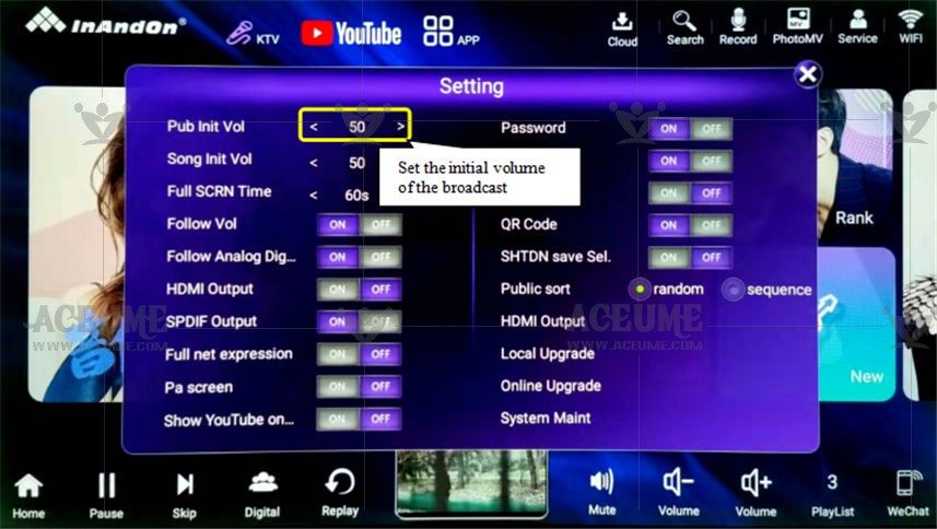 ● Click 【Service】--【Setting】, enter the password "347437", click "Confirm", and select "Set initial volume of public songs" to enter the setting interface.