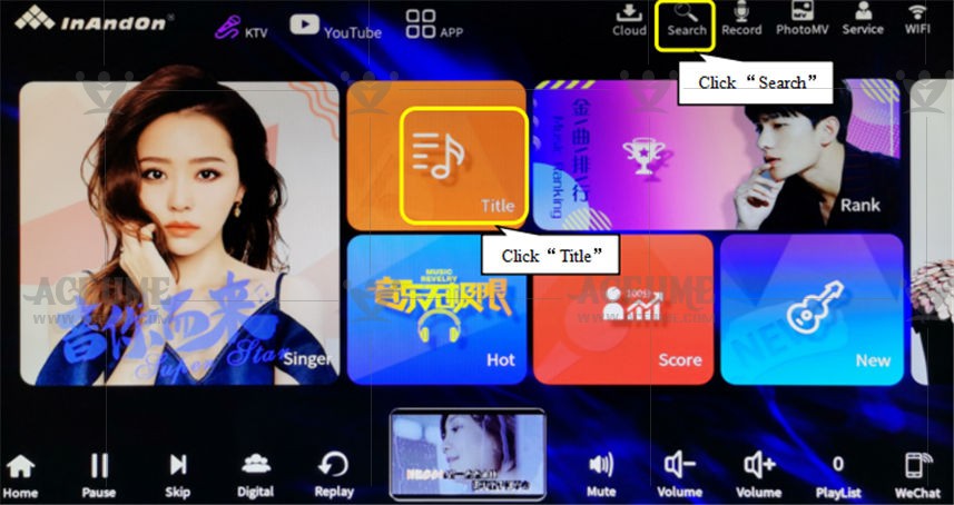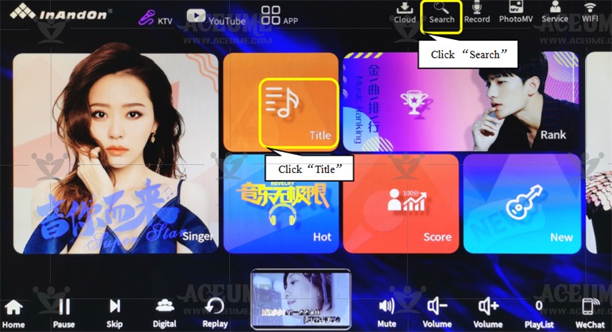 ● Home click 【Search】or click【Title】to enter the song list. Recommend Simple quick look: Pinyin and handwritten, search for like songs.