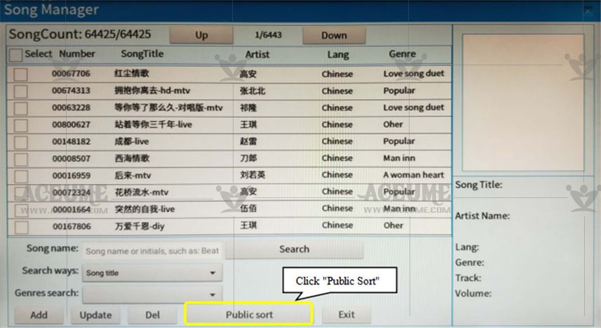 ●Click 【Service】--【Settings】, enter the password '347437', select【System Maintenance】--【Song Management 】--【Public Broadcast Sorting】 to enter the public broadcast list to edit public songs, and set the completed "Public Broadcast Songs" View and play on demand in the "clicked" list.