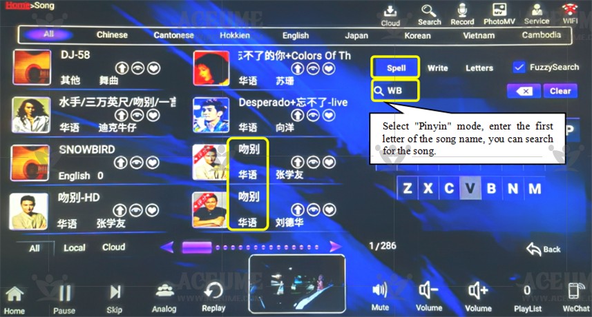 (1) For example, find the song "kiss goodbye", select "Spell" method, and enter "WB" in the right box After input, related songs can be displayed.