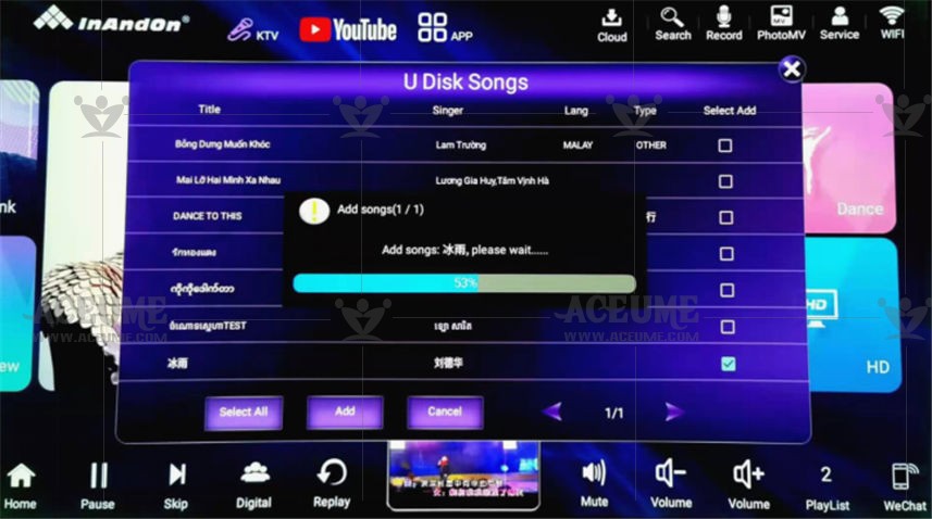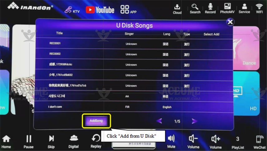 (2) After inserting the U disk, click the "U disk add song" icon on the home page (second page) to enter this function. Click 【U Disk Add】