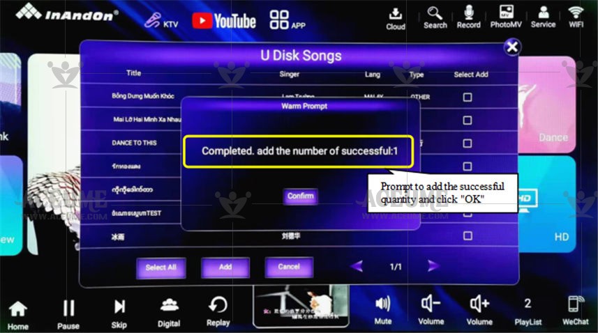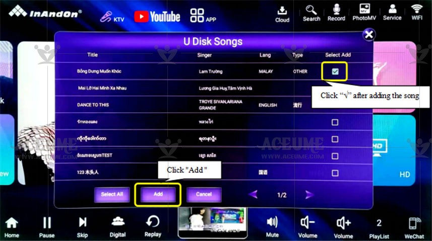 ●Add songs: tick the songs that need to be added and then click add songs to do the corresponding operations to add them to the hard disk of the karaoke machine. To