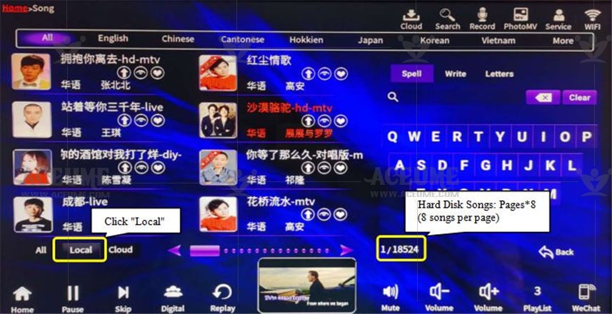 ● Click【Song Title】to enter the song list, (each page contains 8 songs and then click) select【Local】,it will only list the songs in the hard disk, the use page *8 is the number of songs loaded.