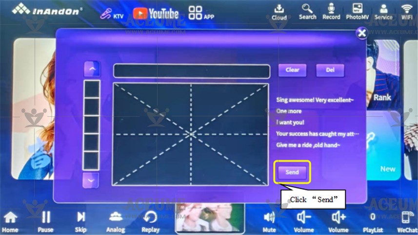 ● When clicking 【Mood】 user's K song, send the text you want to express to the TV interface through handwritten blessing.