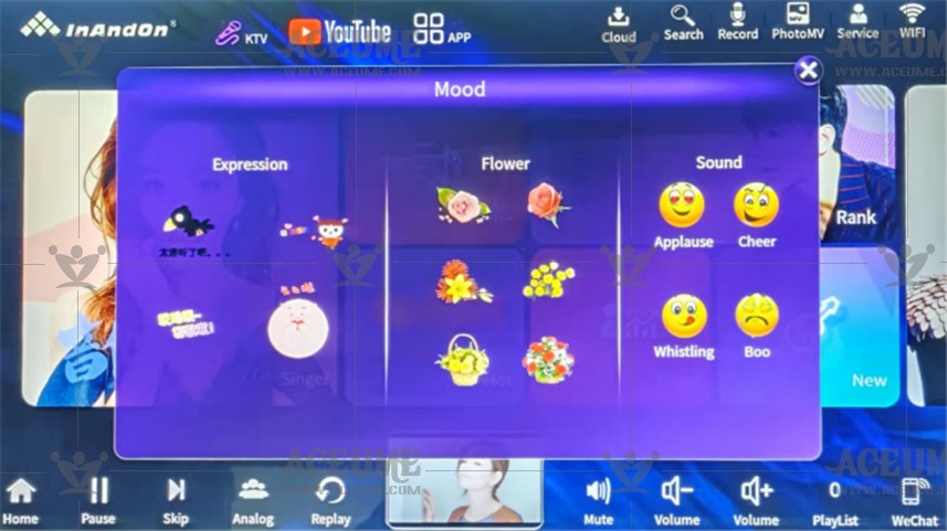 ● Tap 【Mood】 to send designated emoticons, flower pictures, sound effects, applause, cheers, whistles, and inverted colors to the song playback screen.
