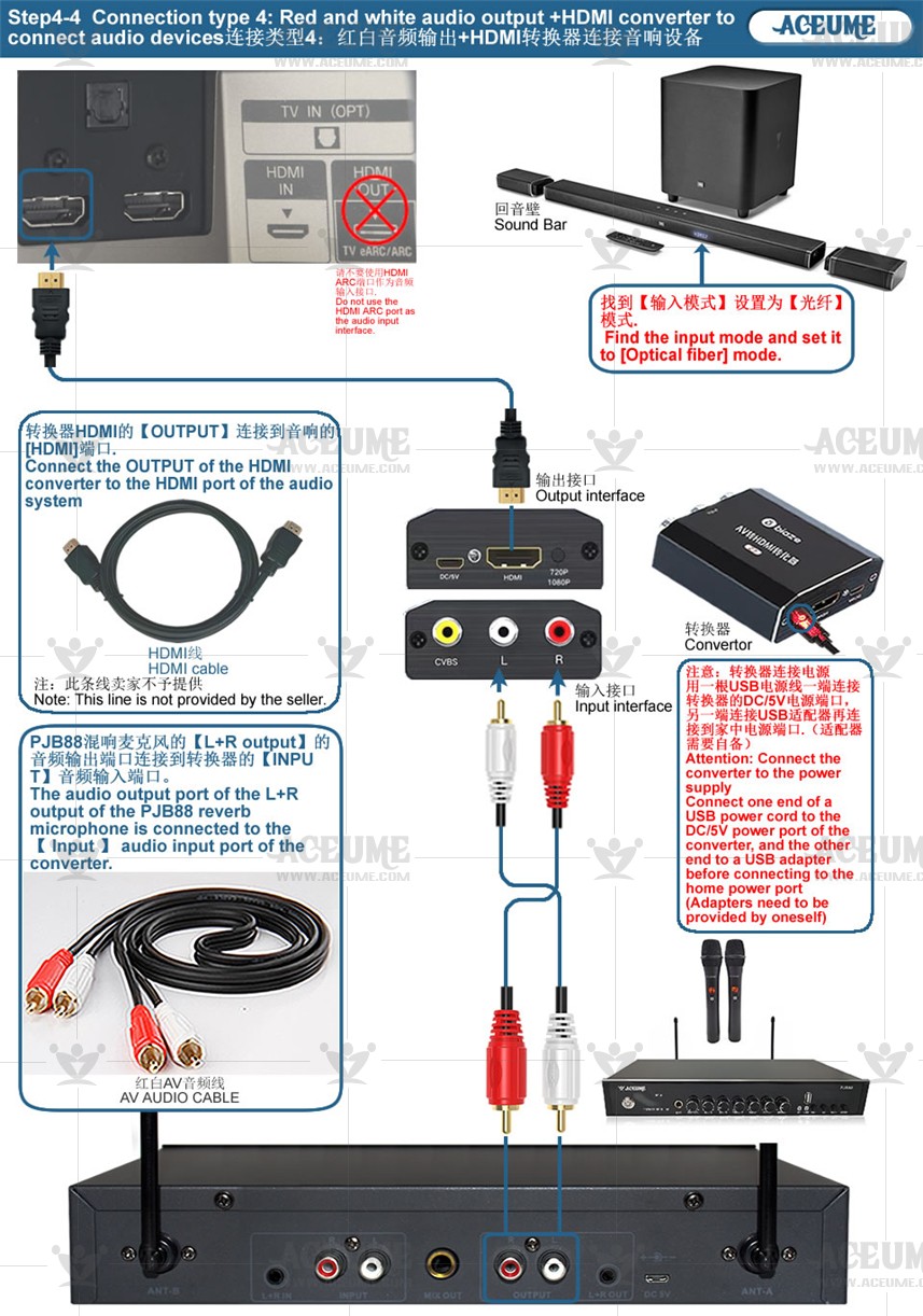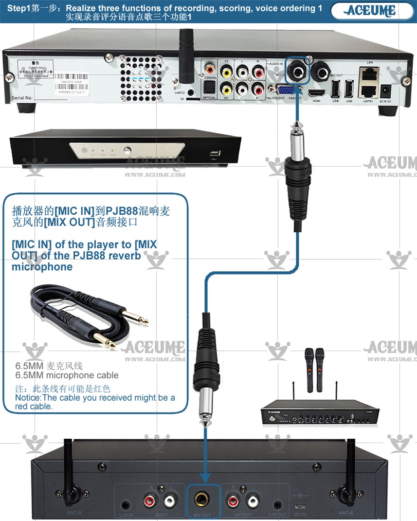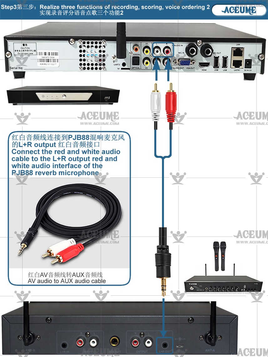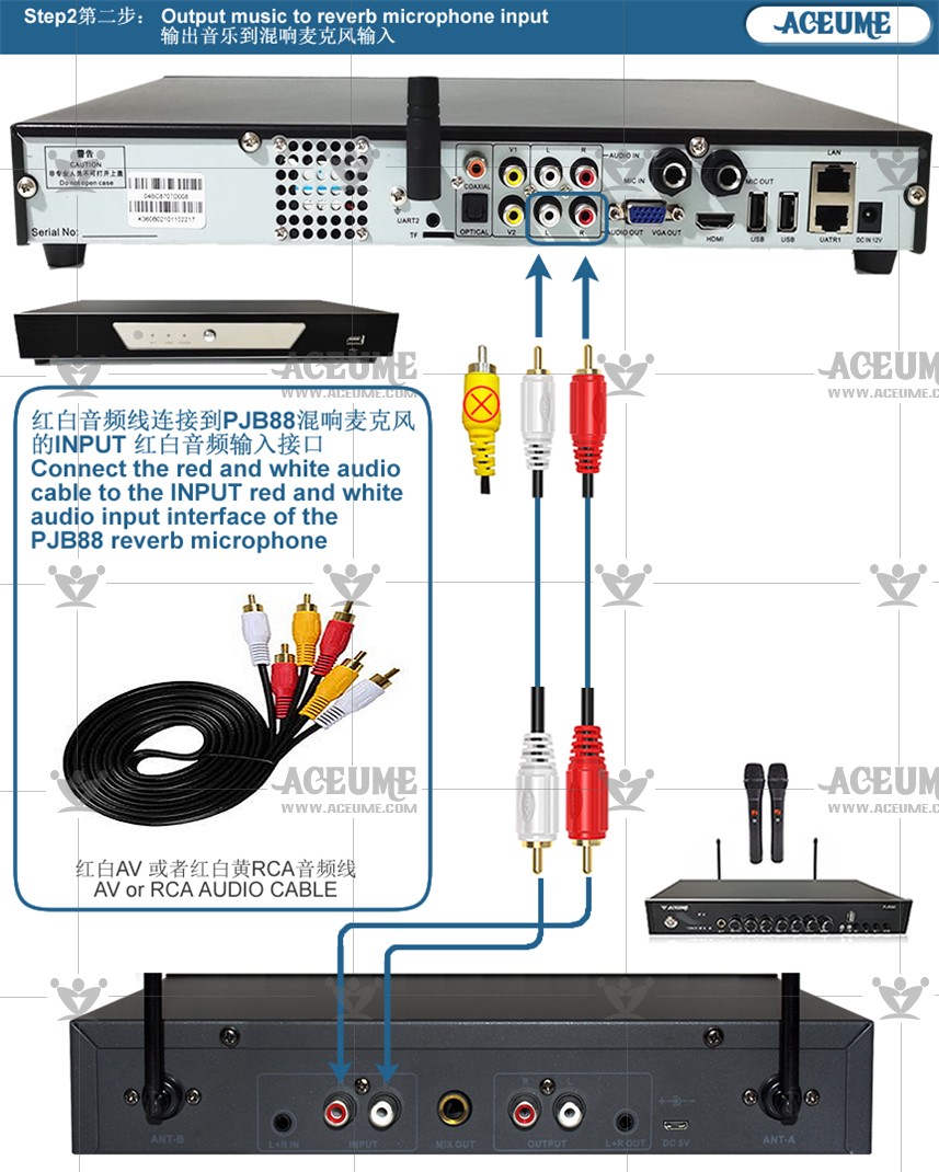 ☟TSR22CB+20-v6播放器+PJB88混响麦克风+功放设备全部线材连接分步骤说明