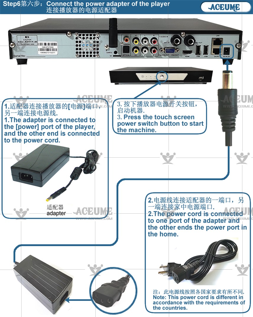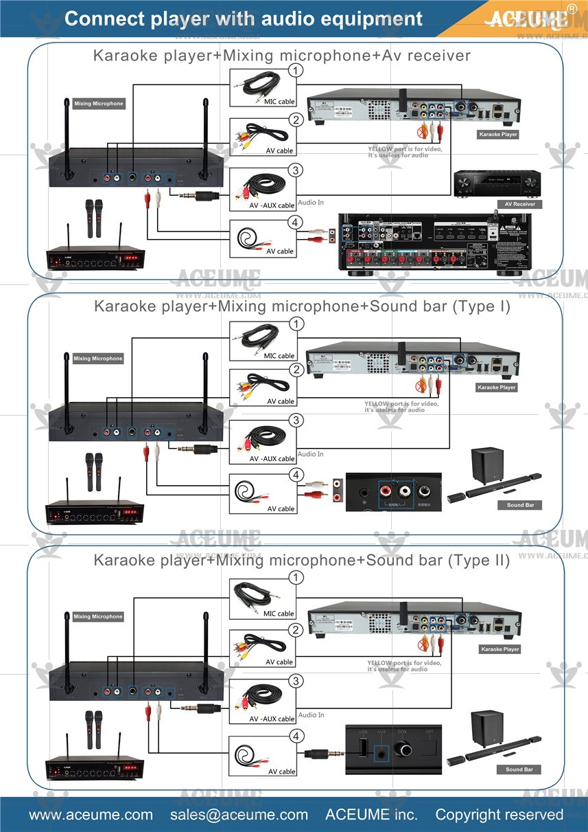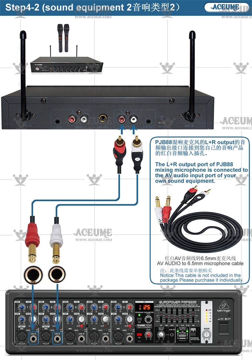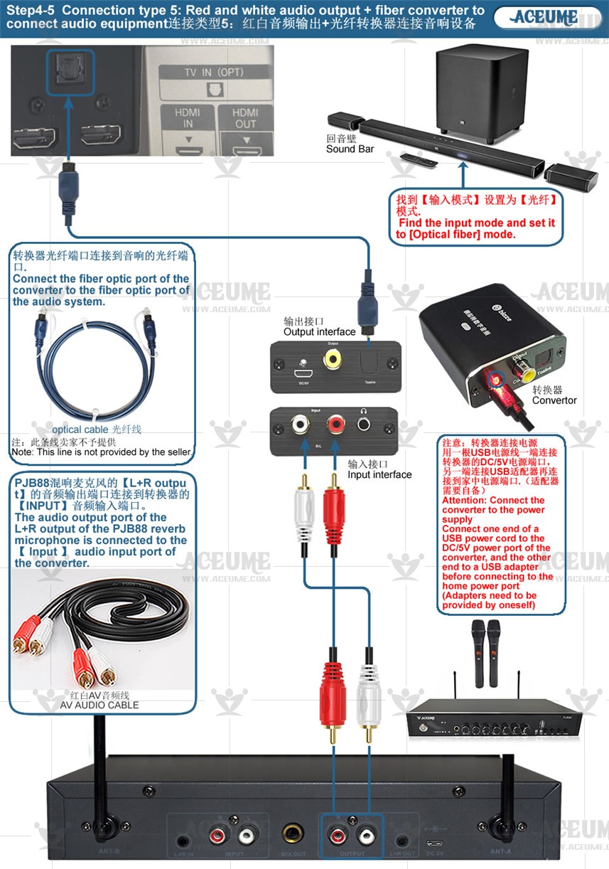 ☟TSR22CB+20-v6播放器+PJB88混响麦克风+功放设备全部线材连接分步骤说明
